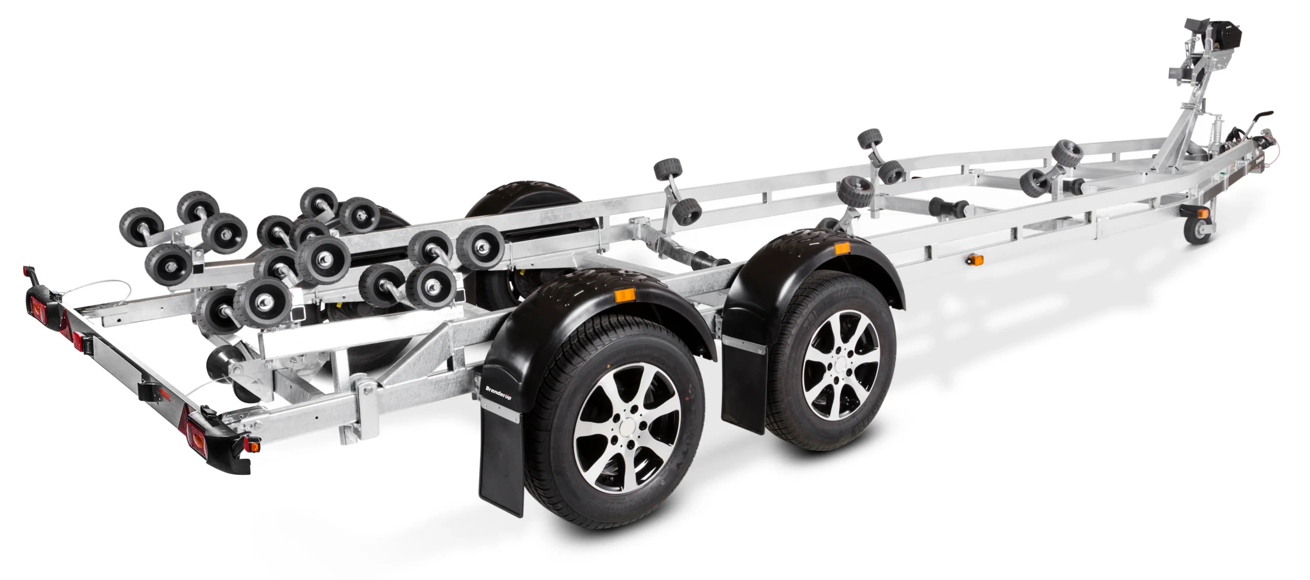 Solider Trailer mit gebremster Einachse und variabler Auflage für den zuverlässigen Transport von Booten bis 6,60 m.