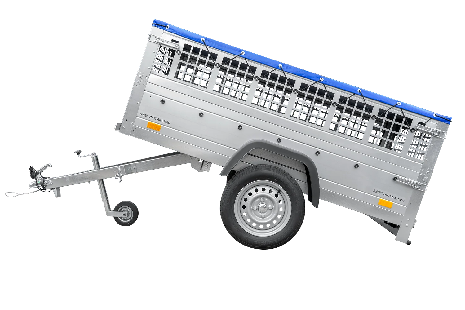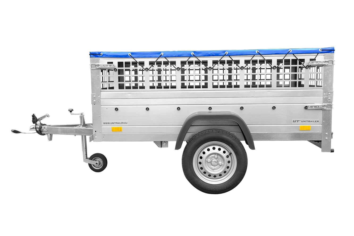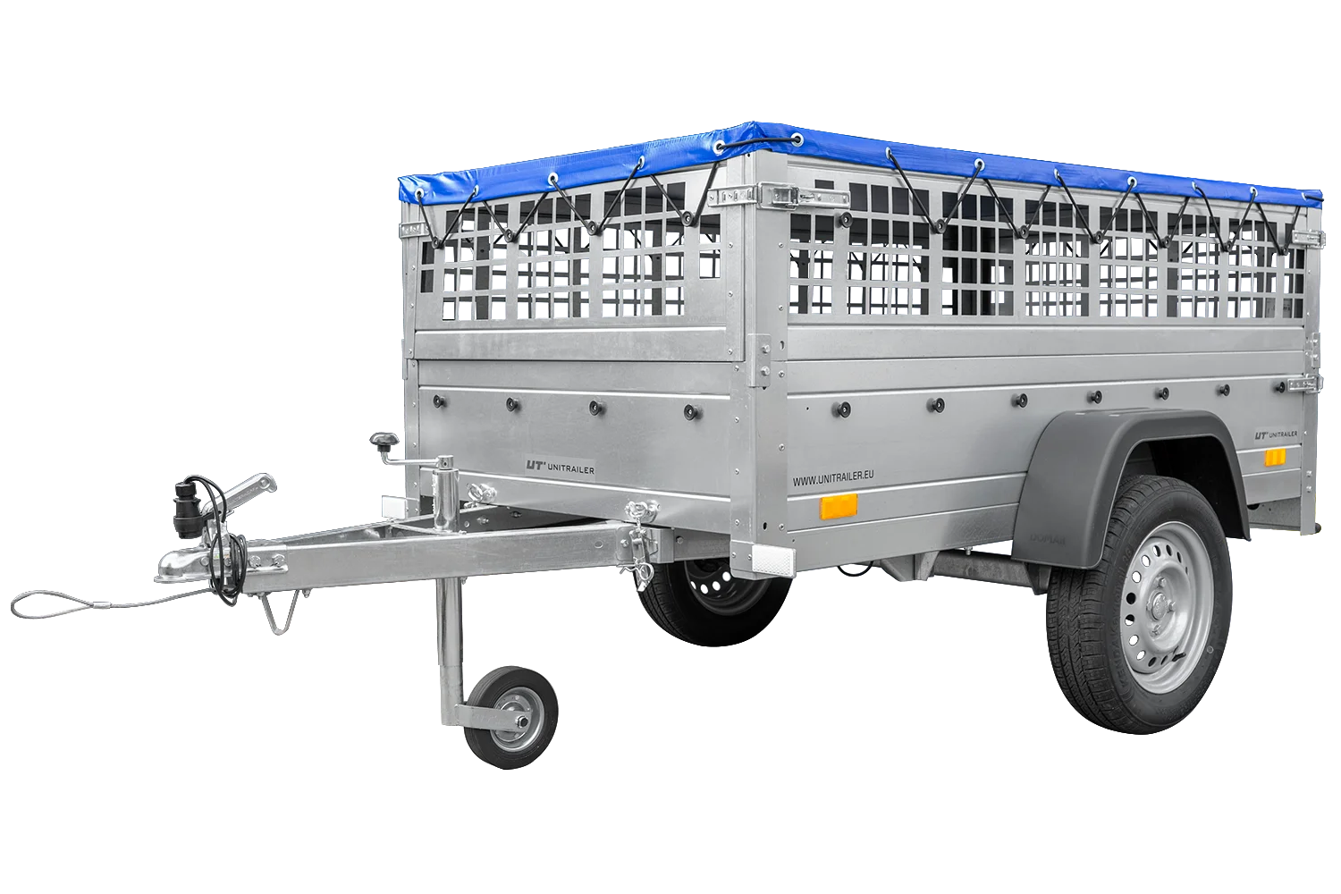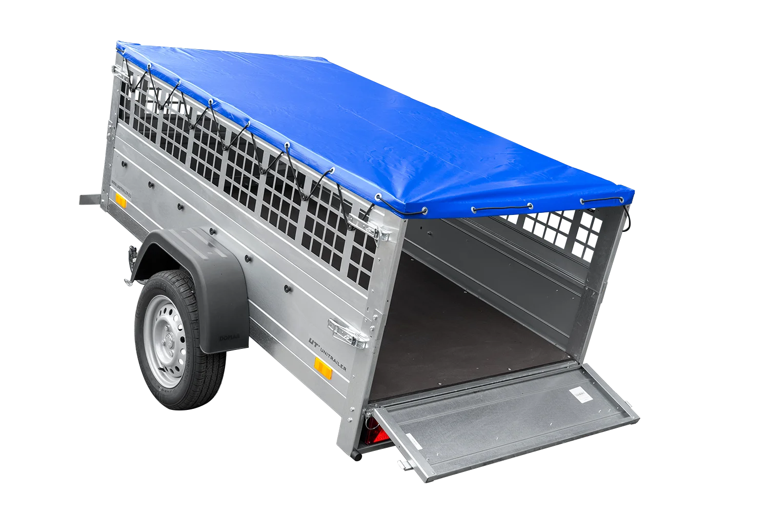 Leichter Einachs-Pkw-Anhänger mit klappbarer V-Deichsel, blauer Flachplane und Gitteraufsätzen. Der UNITRAILER Garden Trailer 200 KIPP eignet sich für den geschützten Transport von Garten- und Heimwerkerbedarf sowie sperrigen Gütern. Die vollverzinkte Konstruktion sorgt für Korrosionsschutz und stabile Fahreigenschaften.