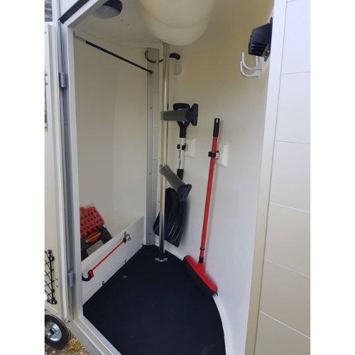 - Sattelkammer: teleskopische Sattelhalter, Spiegel, Türnetze, Besen und Schaufel