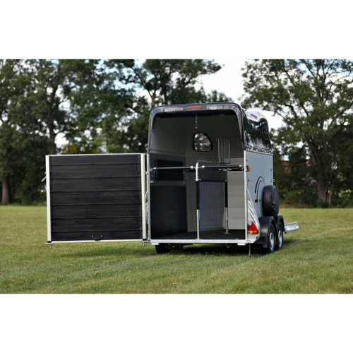 Cheval Liberté Hippomobile (Baujahr 2021, Erstbesitz, Zustand: neu) für Gespannfahrer. Heckrampe und Transport mit Kopf nach vorn. Mit galvanisierter Kutschenplattform inkl. Ankuppelsystem und Verriegelungsstange. Wahlweise Classic mit 18-mm Multiplexseiten (weiß/grau) oder Aluline mit Aluminiumwänden (schwarz, dunkelgrau, hellgrau, rot, weiß).